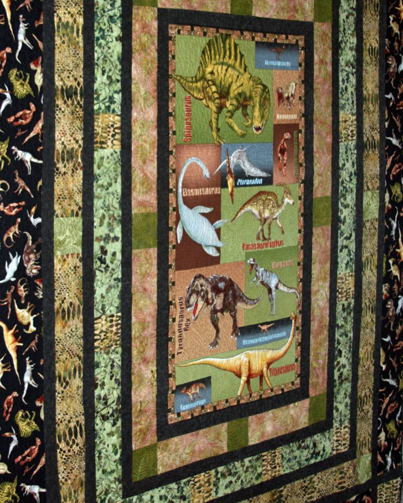 Dinosaurs might have walked the earth millions of years ago, but they seem mythical, at least to my boys. They asked me to make them dinosaur quilts many times, so I went for it once we found fabric they liked (see the center panel below):