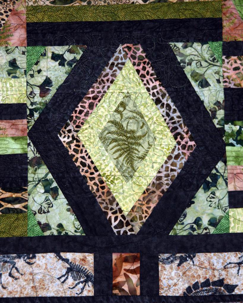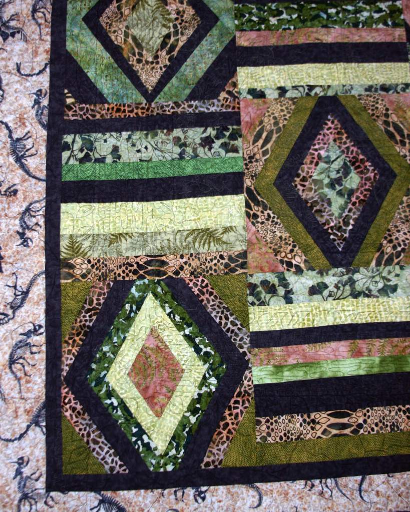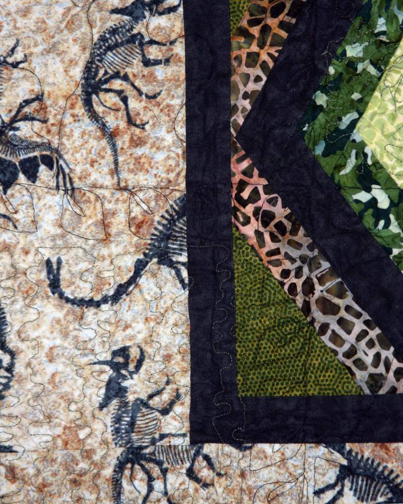 The alternate block was simply a rail fence block – I used strips that were not exactly straight, nor were they the same width along their length. This kept the feral theme going , until I ran short on fabric. I ended up having to wait until I went to the Santa Clara IQF, where I found the dinosaur skeletons! the perfect border, considering the border on the top was dinosaurs of the same size (except with skin!)