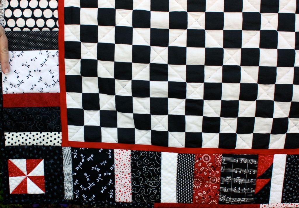 I had an idea for a (what I thought would be fast) baby quilt for my son’s tutor, who was about to have a baby. New babies have a hard time focusing their eyes when little, so what better to use than (mostly) black and white prints! Some black and white checkerboard fabric would make a perfect center piece, along with snippets of red, white and black prints as a border. This quilt was almost entirely improvisation, including the red and white pinwheels in the corners.