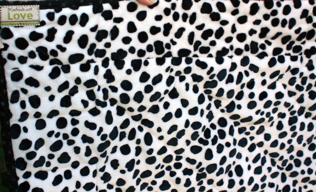 on the back, I used some Minkee fabric in dalmatian print ( as in “101 Dalmatians”). It was super soft and cozy – just perfect for snuggling. What I didn’t know was how hard it would be to sew (very slippery!), so I had to use a walking foot.
