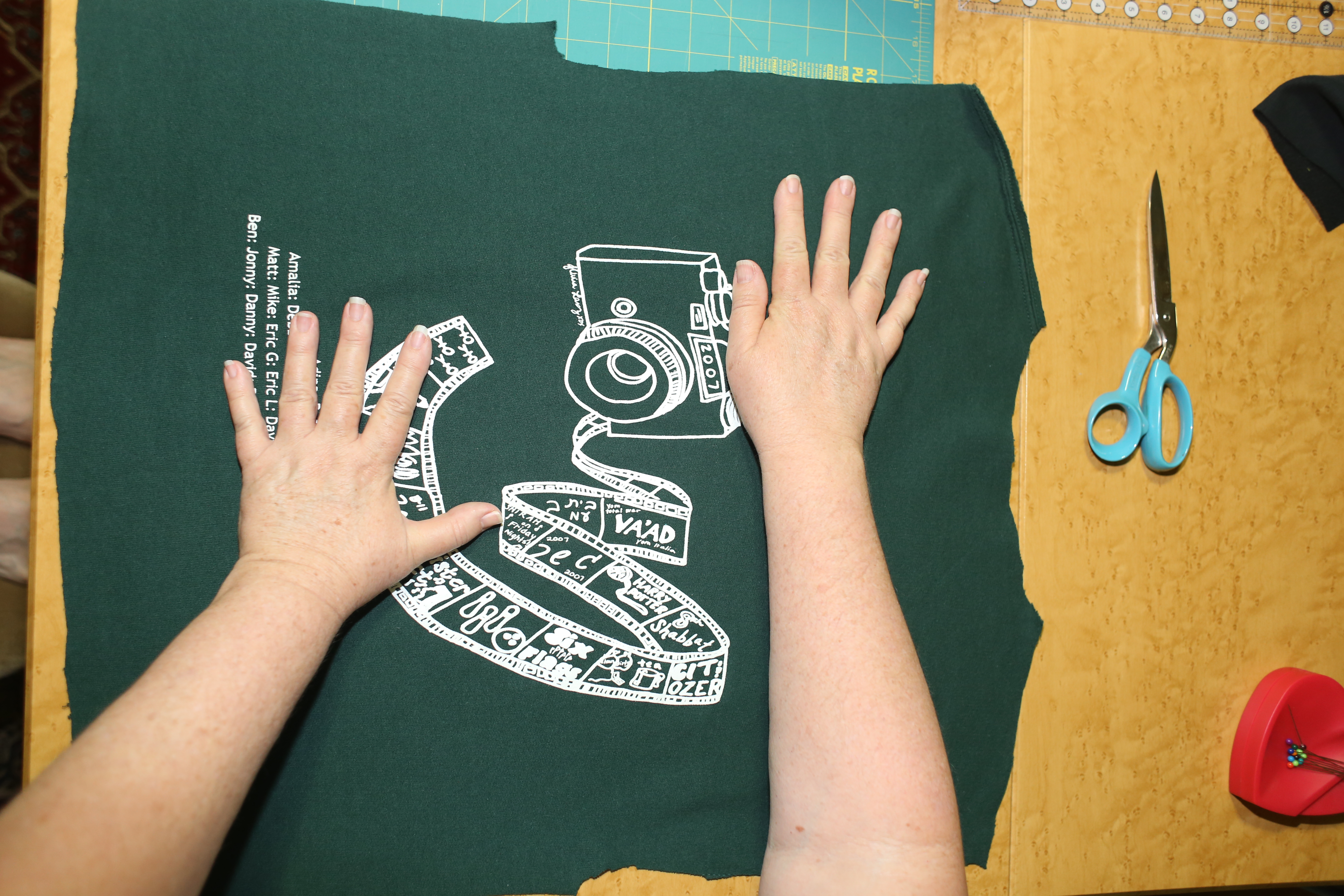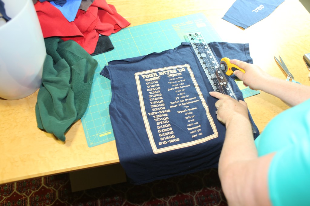 4) What color scheme (if any)? Her shirts were many colors, which, will be a trick to arrange. However, she wants as little sashing as possible (or none).  We will have to choose a backing fabric and a binding so I will wait until the quilt top is assembled before selecting fabric. Often, after a quilt top is finished, an obvious color choice presents itself.   Camp Ramah’s colors are green and blue, and a majority of her shirts are these colors, so it’s likely that we can find a fabric that works (yay! more fabric shopping!)
