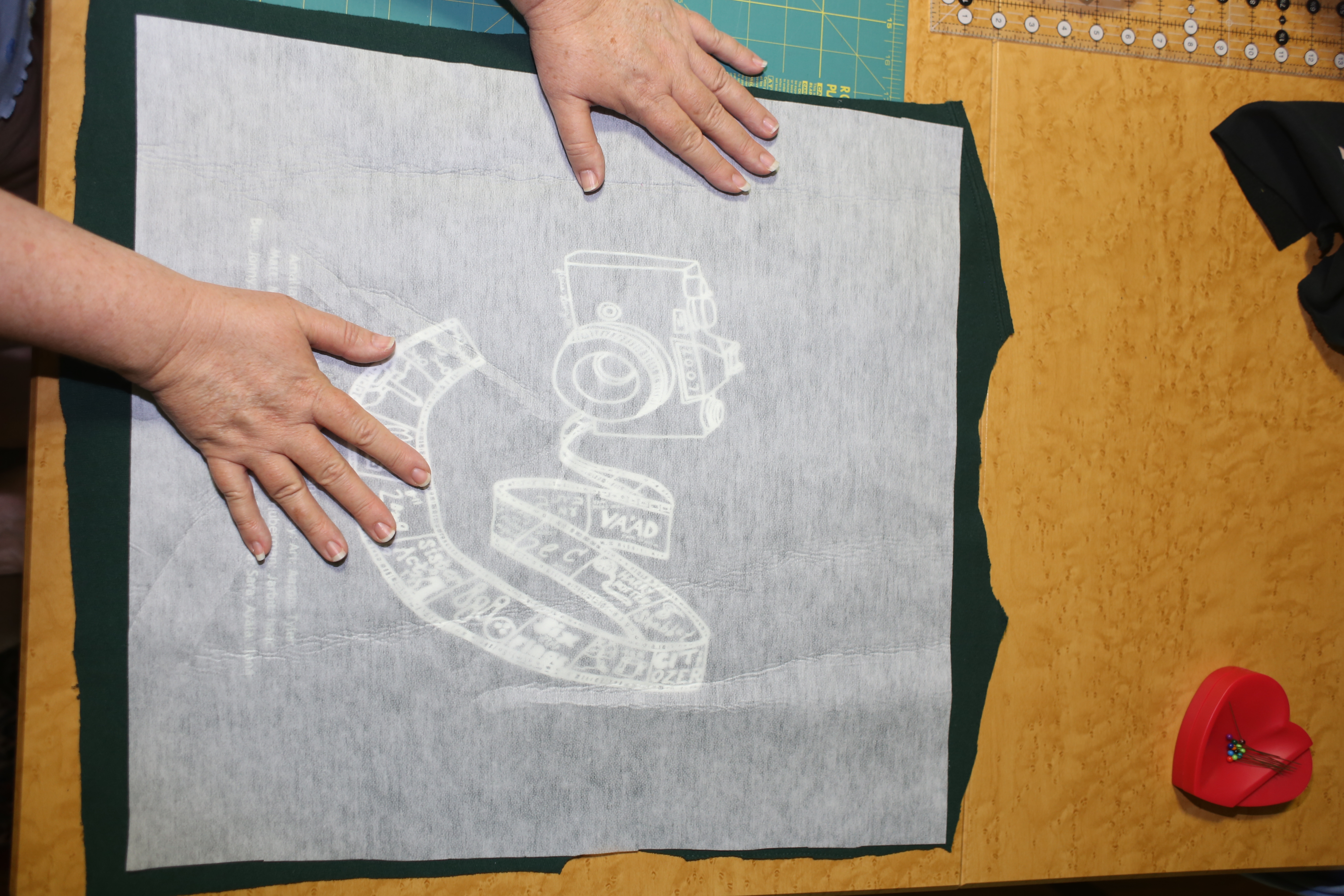 Fusible is next (however, if pinned, the fusible is in the correct orientation, and is sufficiently covering the logo), followed by a damp pressing cloth on top. Below I am using a leftover scrap of t-shirt as a pressing cloth.  Remove the pins before pressing (can’t say that enough!)