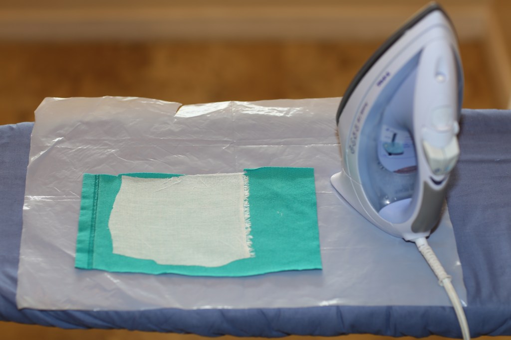 Before pressing “for real”, it’s a good idea to do a test fuse on some scraps (t- shirt and interfacing) using the instructions on the fusible.  Use a hot iron – Pellon 911FF recommends a “wool” setting; the fusible in the photo below is called “cool fuse” and the heat setting recommended the “silk” setting.