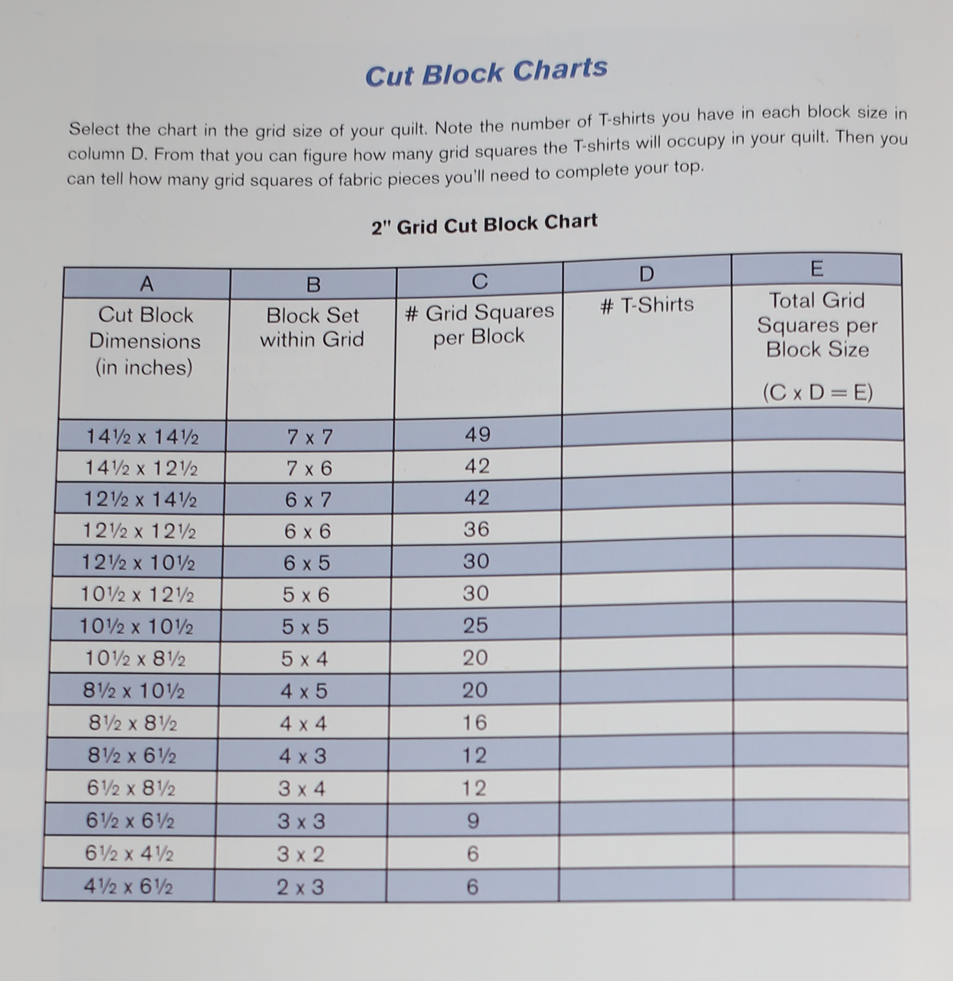 Standard quilt Cut Block Size Chart;